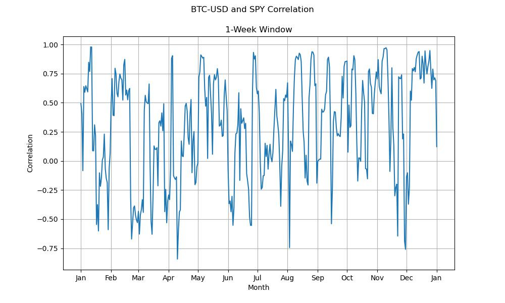Let's examine the statistical correlation between BTC-USD and SPY over different rolling windows in 2024.