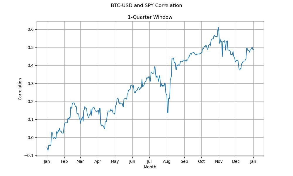 Notice that the correlation dipped to a low of 0.1 right before the halving last May and has steadily risen since then. The correlation ended at a high point above 0.35 at the end of the year. So Bitcoin is positively, though not perfectly, correlated with the market. Technically, anything above a correlation of zero is considered positively correlated, but the correlation over a year does not break 0.5. So we cannot say that it is close to perfectly correlated, but there is a definite trend that the correlation has increased. Now let's examine the correlation over a rolling one-quarter window. So I calculate the correlation just over the last three months for any day in 2024: