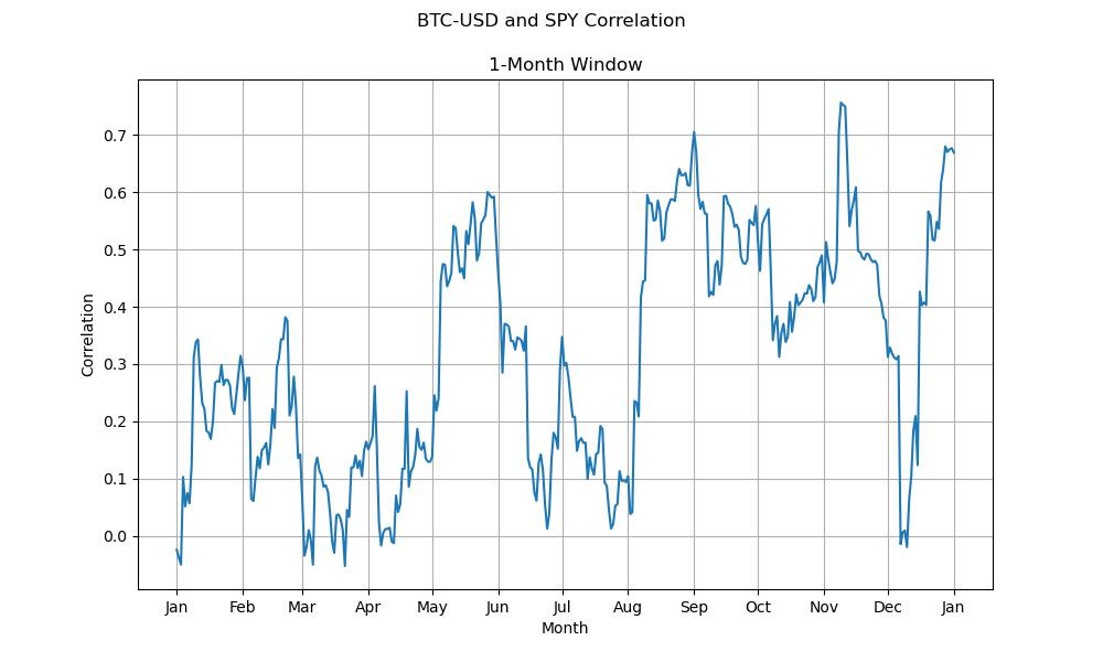 What about shorter horizons? Let's consider the correlation over a rolling one-month window. So for example, a correlation of 0.5 on June 1, 2024, gives the statistical correlation between BTC-USD and SPY from May 1, 2024 to June 1, 2024. Here's a graph of the rolling one-month window: