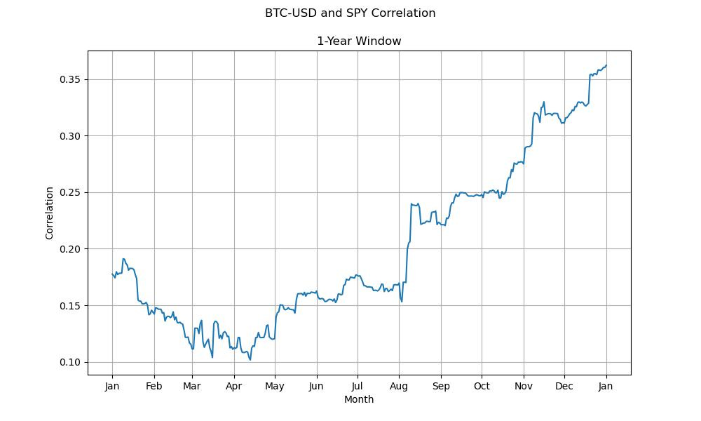I examine the statistical correlation between BTC-USD and SPY over a rolling window. First consider the rolling one-year window. For example, a correlation of 0.32 on December 1, 2024, means that the statistical correlation between BTC-USD and SPY from December 1, 2023, to December 1, 2024 was 0.32. Using this metric, we can plot the correlation over the one-year window as: